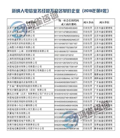 2019年一季度依據(jù)電信條例、電信業(yè)務(wù)經(jīng)營許可管理辦法等相關(guān)規(guī)定,電信管理機構(gòu)對在經(jīng)營電信業(yè)務(wù)、開展互聯(lián)網(wǎng)信息服務(wù)、落實網(wǎng)絡(luò)與信息安全責(zé)任等方面存在違規(guī)行為的27家企業(yè),給予警告、罰款等行政處罰并將其新納入電信業(yè)務(wù)經(jīng)營不良名單現(xiàn)予以公布,詳細(xì)信息可登陸全國電信業(yè)務(wù)市場綜合管理信息系統(tǒng)查詢。